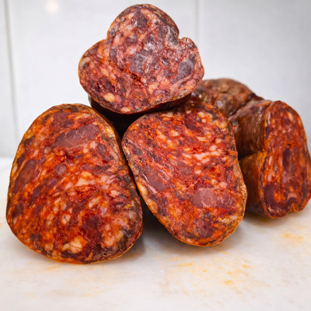 seleccionadas de cerdo y especias naturales, embutido en tripa gruesa y curado lentamente