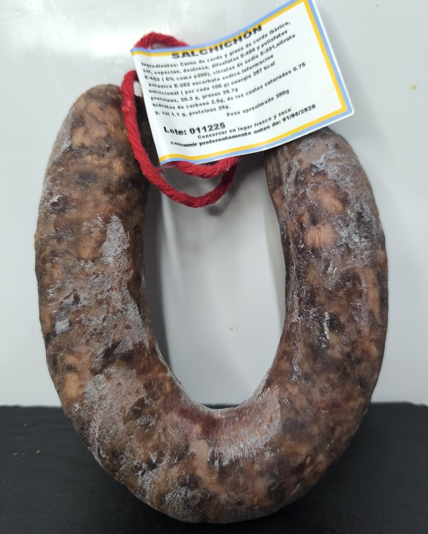 Salchichón casero elaborado con una receta tradicional y carne de cerdo seleccionada. El truco del yayo, que nunca falla, y una curación lenta que le aporta el sabor auténtico de siempre.